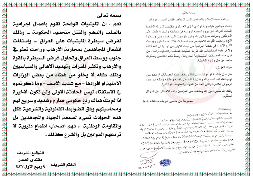 استغلال المليشيات الوقحة انشغال المجاهدين بمحاربة الارهاب للقيام بأعمال اجرامية وتهديد الاهالي استفتاء السيد القائد مقتدى الصدر اعزه الله 22 - 12 - 2015
