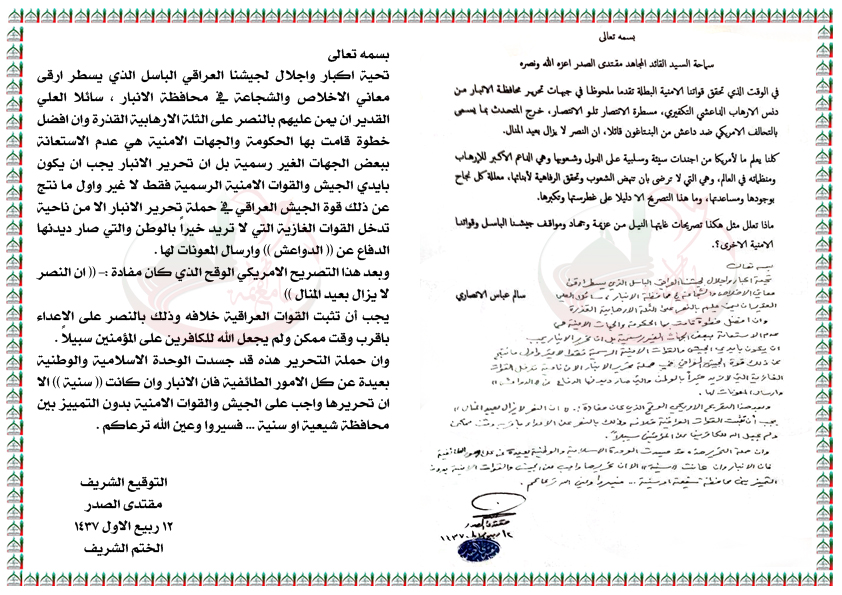 عمليات تحرير محافظة الانبار وتصريح المتحدث باسم التحالف الامريكي بان النصر بعيد المنال استفتاء السيد القائد مقتدى الصدر اعزه الله 25 - 12 - 2015
