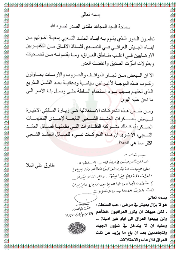 تحركات المالكي الاستغلالية ومحاولة ركوب الموجة من خلال الحشد الشعبي المجاهد استفتاء السيد القائد مقتدى الصدر اعزه الله 31 - 12 - 2015