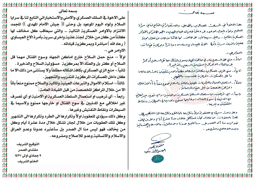 أوامر عسكرية الى الاخوة في السلك العسكري والامني والاستخباراتي في سرايا السلام ولواء اليوم الموعود وجيش الامام المهدي(عج) بيان السيد القائد مقتدى الصدر اعزه الله 18 - 2 - 2016