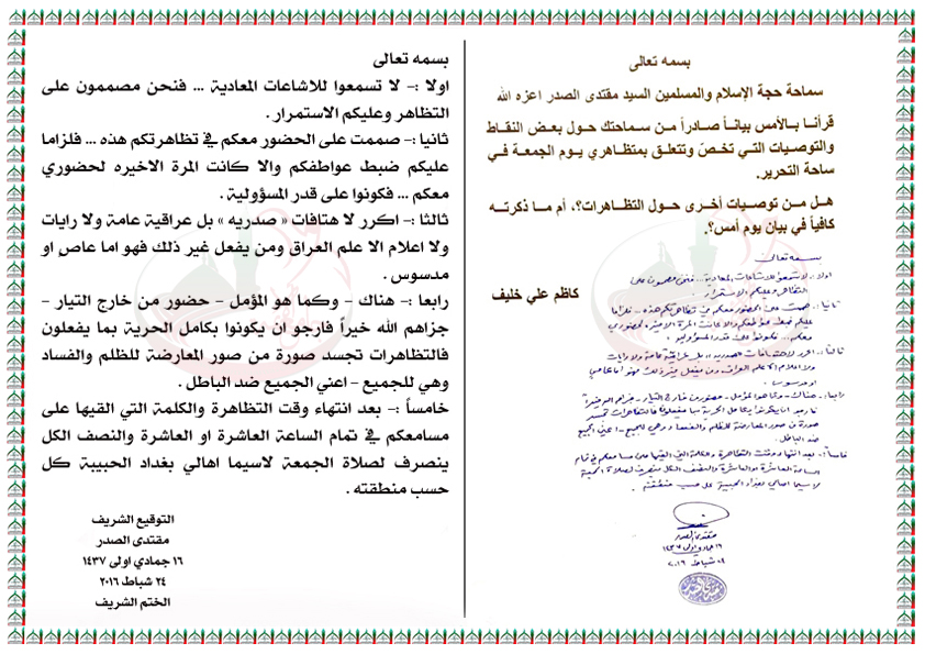 توصيات اخرى حول التظاهرات في ساحة التحرير غدا الجمعة استفتاء السيد القائد مقتدى الصدر اعزه الله 25 - 2 - 2016