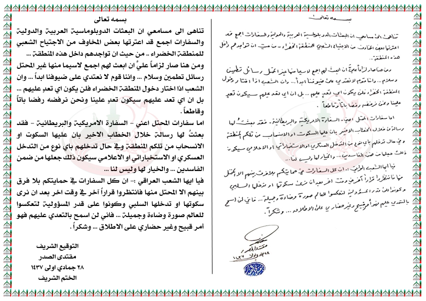 رسائل تطمين وسلام للبعثات الدبلوماسية لاسيما غير المحتل منها بيان السيد القائد مقتدى الصدر اعزه الله 8 - 3 - 2016