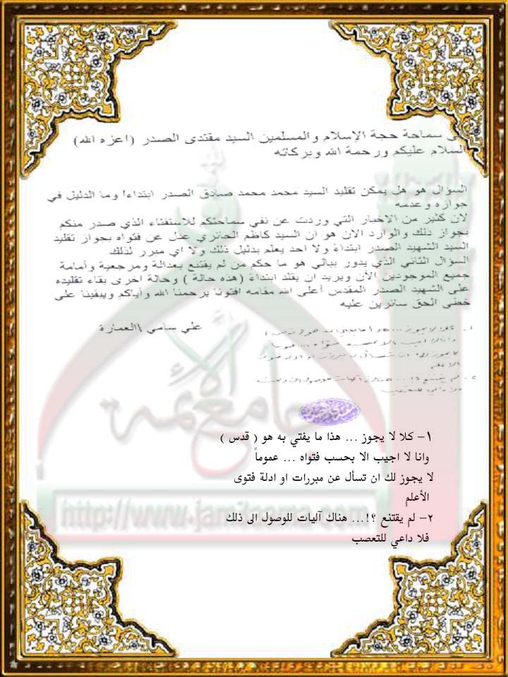 السيد مقتدى الصدر يجيب على استفتاء حول تقليد السيد الشهيد ابتداءا بتاريخ 5/4/2011