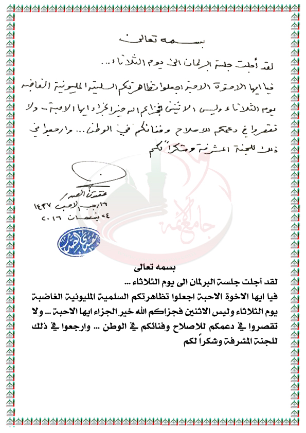 تأجيل المظاهرة المليونية الى يوم الثلاثاء تزامنا مع جلسة البرلمان بيان السيد القائد مقتدى الصدر اعزه الله 24 \ 4 \ 2016