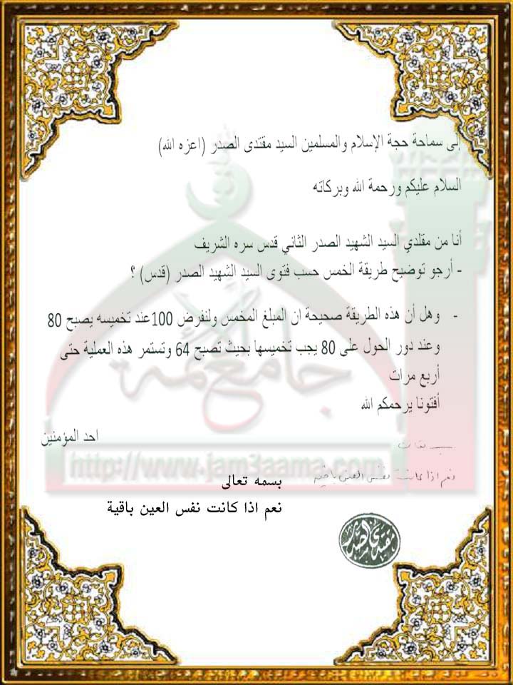 طريقة التخميس عند السيد الشهيد(استفتاء للسيد القائد بتاريخ 6-4-2011)