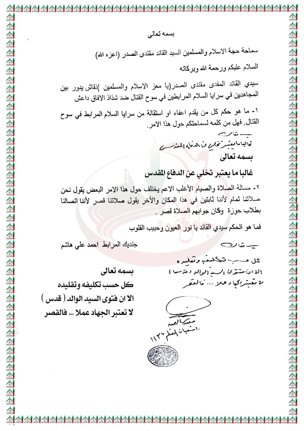 طلب الاعفاء أو الاستقالة من صفوف سرايا السلام وحكم الصلاة والصوم بالنسبة للمرابطين في سوح الجهاد استفتاء السيد القائد مقتدى الصدر اعزه الله 18 \ 5 \ 2016