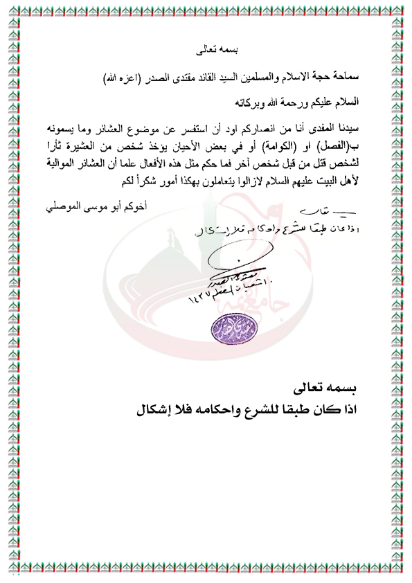 الرأي الشرعي بالفصل وغيره من سنن العشائر استفتاء السيد القائد مقتدى الصدر اعزه الله 19 \ 5 \ 2016