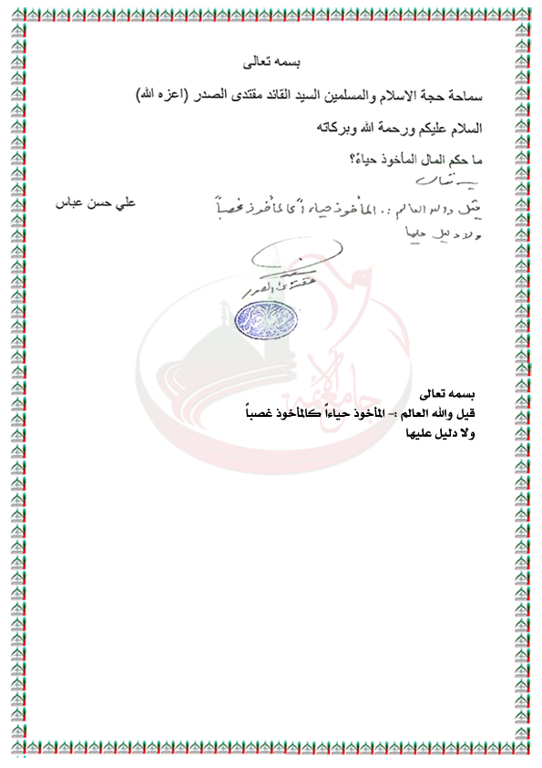 حكم المال المأخوذ حياءً استفتاء السيد القائد مقتدى الصدر اعزه الله 22 / 5 / 2016