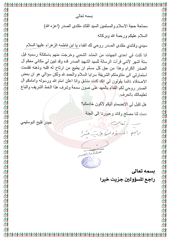 طلب أحد الاشخاص الانتماء لسرايا السلام المجاهدة استفتاء السيد القائد مقتدى الصدر اعزه الله 23 / 5 / 2016