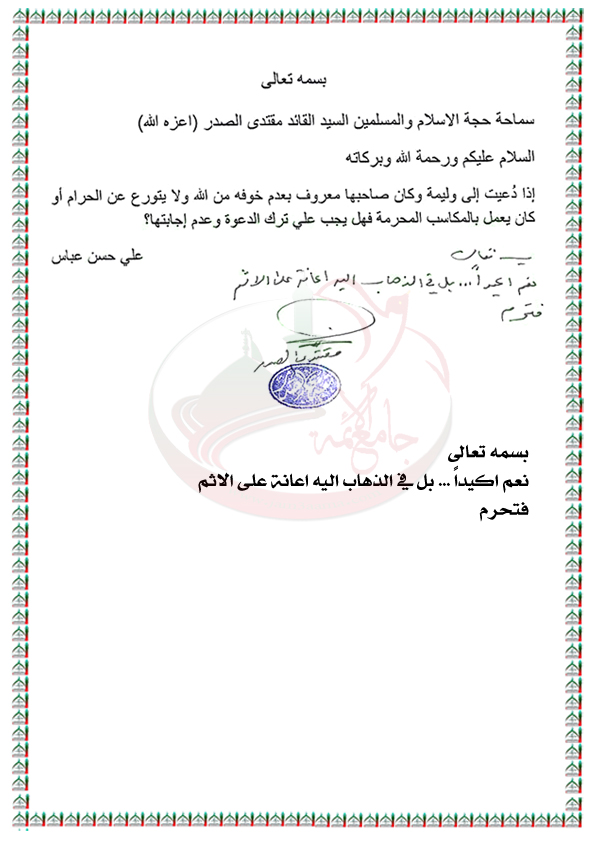 قبول الدعوة لوليمة من شخص غير متورع عن الحرام أو كان يعمل في الكسب المحرم استفتاء السيد القائد مقتدى الصدر اعزه الله 24 \ 5 \ 2016
