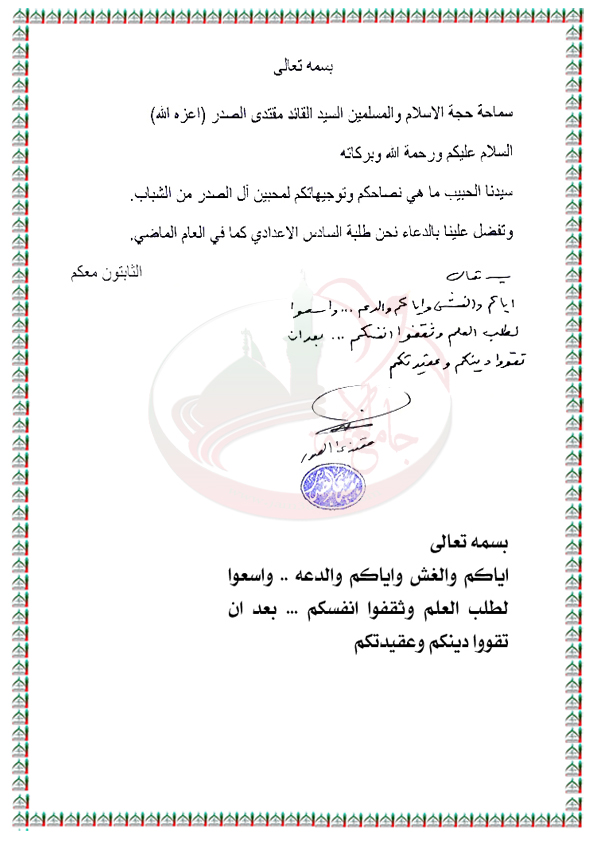 حث الشباب والطلبة على تقوية دينهم وعقيدتهم والسعي لطلب العلم والثقافة والتحذير من الغش والدعة استفتاء السيد القائد مقتدى الصدر اعزه الله 26 / 5 / 2016
