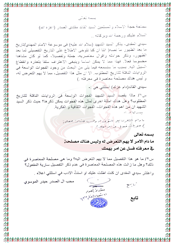 اسئلة حول موسوعة الامام المهدي (عج) استفتاء السيد القائد مقتدى الصدر اعزه الله 30 / 5 / 2016