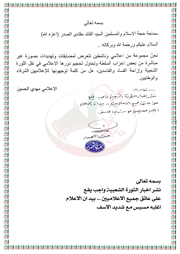 نشر أخبار الثورة العراقية واجب يقع على عاتق جميع الاعلاميين استفتاء السيد القائد مقتدى الصدر اعزه الله 1 / 6 / 2016