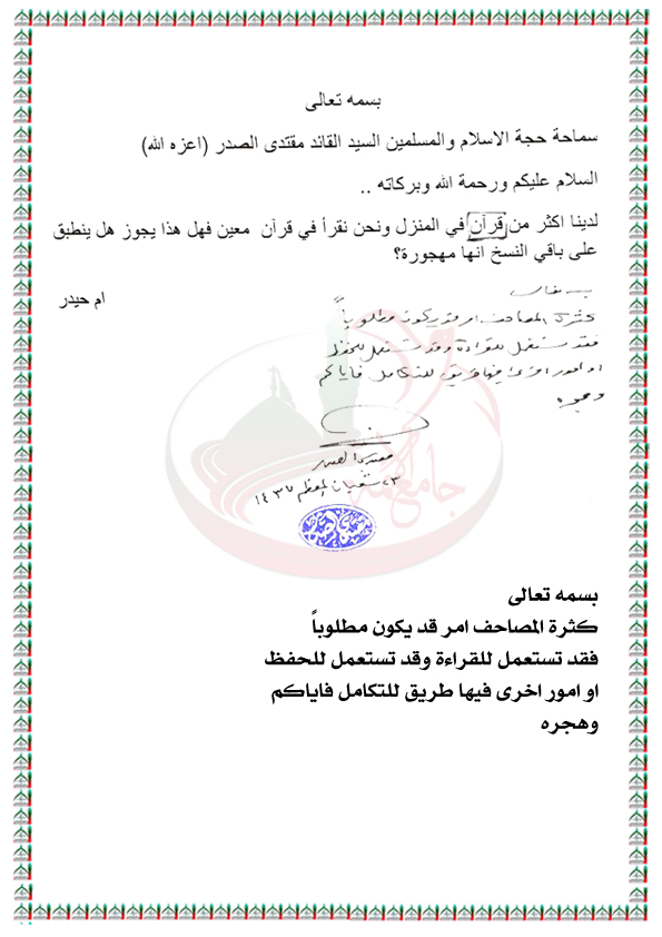 وجود أكثر من نسخة للقران الكريم في بيت لا تتم التلاوة بها والاكتفاء بنسخة معينة استفتاء السيد القائد مقتدى الصدر اعزه الله 1 / 6 / 2016