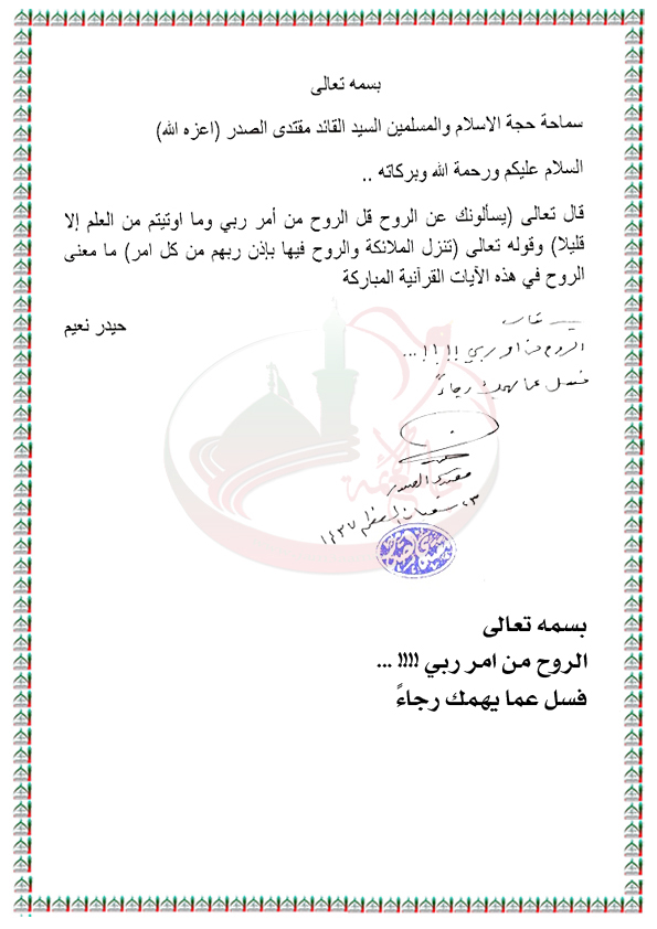 معنى الروح الذي ورد في بعض آيات القران الكريم استفتاء السيد القائد مقتدى الصدر اعزه الله 1 / 6 / 2016