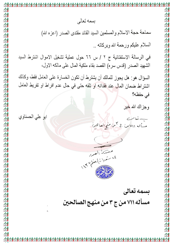 شروط تشغيل الاموال استفتاء السيد القائد مقتدى الصدر اعزه الله 2 / 6 / 2016