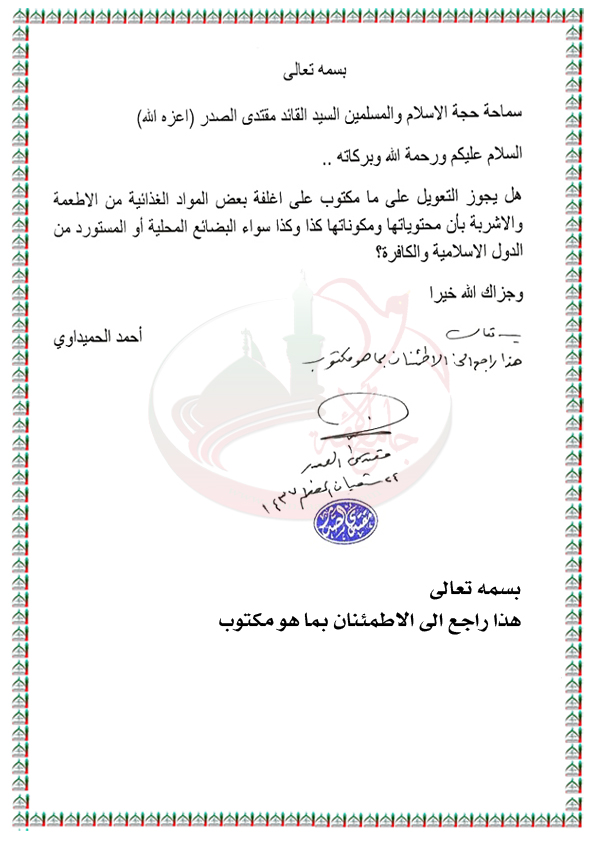التعويل على الاطمئنان في تناول الاطعمة والاشربة المحلية والمستوردة من الدول الاسلامية والكافرة استفتاء السيد القائد مقتدى الصدر اعزه الله 2 / 6 / 2016