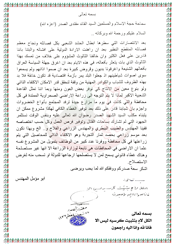 فكرة استصلاح الاراضي الصحراوية وزراعتها لمواجهة أزمة العراق الاقتصادية استفتاء السيد القائد مقتدى الصدر اعزه الله 5 / 6 / 2016