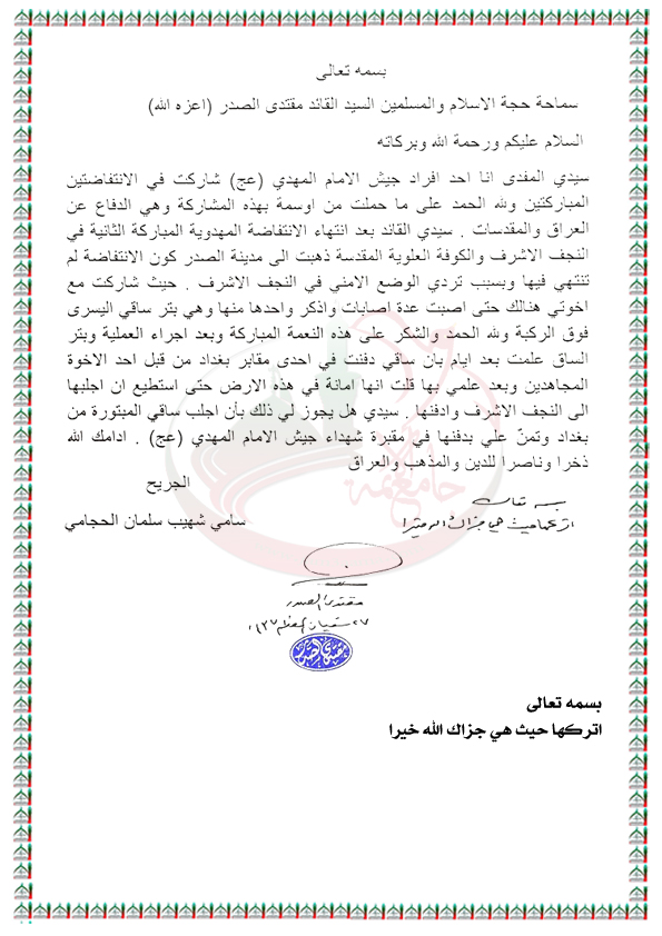 أحد جرحى الانتفاضة المهدوية بترت ساقه وتم دفنها في احدى المقابر ويريد نقلها الى مقبرة الشهداء في النجف الاشرف استفتاء السيد القائد مقتدى الصدر اعزه الله 5 / 6 / 2016