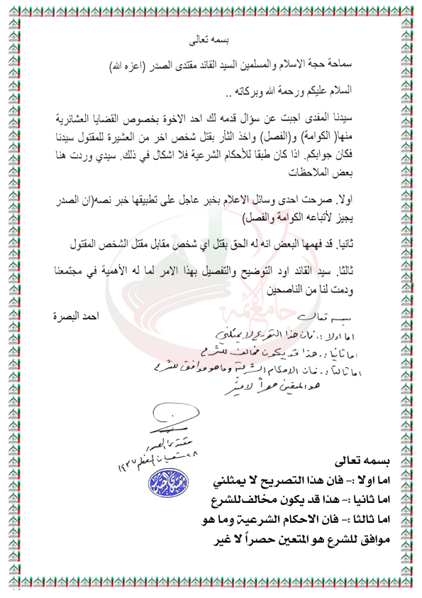 ما اُدعي على سماحته بانه يحيز بعض السنن العشائرية كالكوامة والفصل استفتاء السيد القائد مقتدى الصدر اعزه الله 6 / 6 / 2016