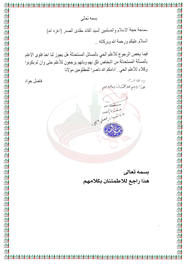 جواز اخذ فتوى المرجع الاعلم الحي في المستحدثات ممن يرجعون اليه من غير وكلائه استفتاء السيد القائد مقتدى الصدر اعزه الله 6 / 6 / 2016