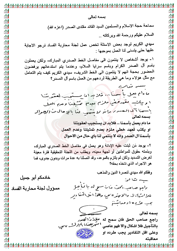 اسئلة تخص عمل لجنة محاربة الفساد استفتاء السيد القائد مقتدى الصدر اعزه الله 7 / 6 / 2016