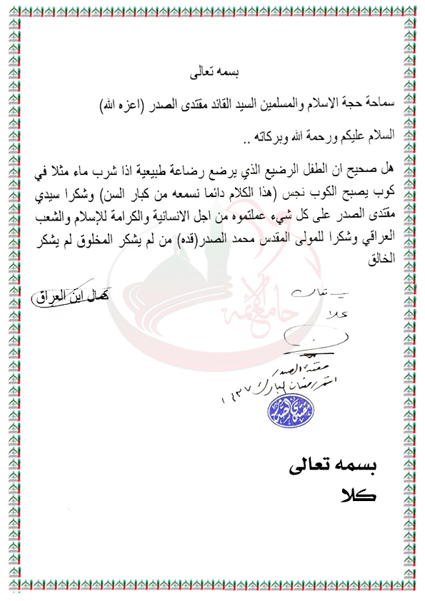 الشرب من نفس الكوب الذي شرب منه الطفل الذي يرضع رضاعة طبيعية استفتاء السيد القائد مقتدى الصدر اعزه الله 8 / 6 / 2016