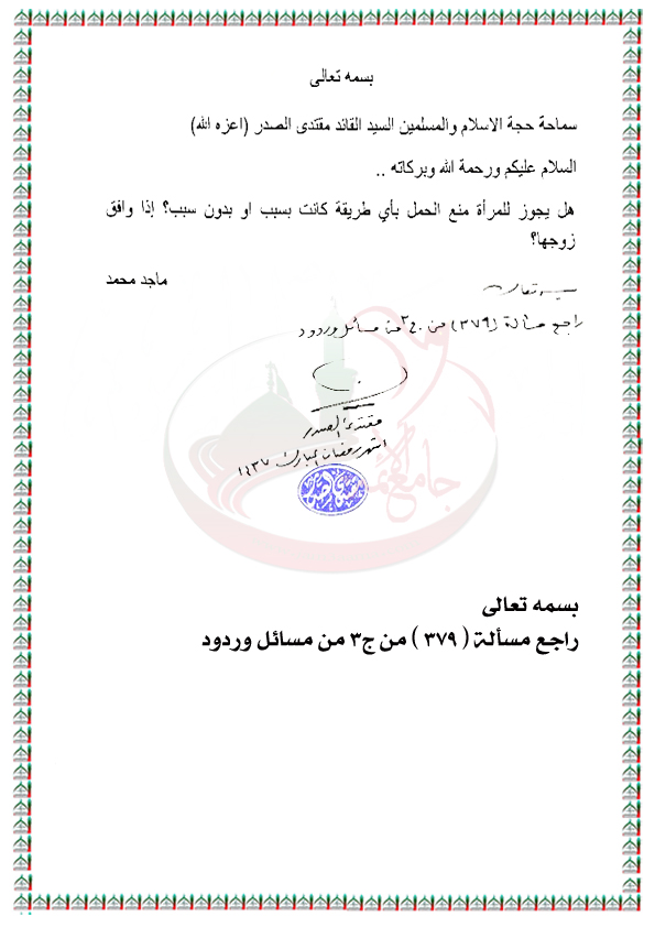المرأة ومنعها الحمل بسبب او بدون سبب مع موافقة زوجها استفتاء السيد القائد مقتدى الصدر اعزه الله 8 / 6 / 2016