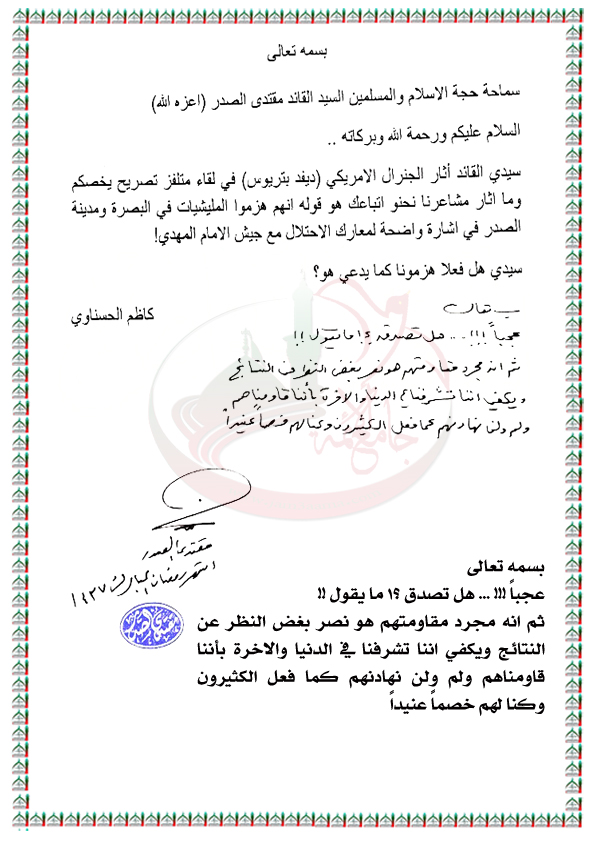 تصريح بترايوس بخصوص سماحته والمقاومة الشريفة استفتاء السيد القائد مقتدى الصدر اعزه الله 8 / 6 / 2016