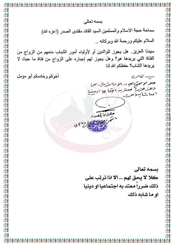 حق الوالدين في إجبار ابنهم بالزواج من فتاة لا يريدها أو منعه من الزواج من فتاة يريدها استفتاء السيد القائد مقتدى الصدر اعزه الله 9 / 6 / 2016