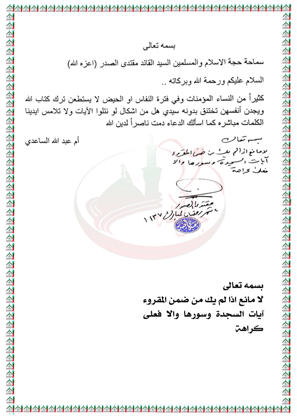 جواز تلاوة القرآن الكريم دون مس حروفه بالنسبة للنساء في فترة النفاس أو الحيض استفتاء السيد القائد مقتدى الصدر اعزه الله 10 / 6 / 2016