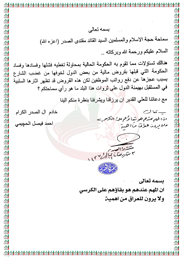قيام الحكومة بتغطية فشلها وفسادها من خلال قروض دولية تؤدي الى الهيمنة على ثروات البلد استفتاء السيد القائد مقتدى الصدر اعزه الله 12 / 6 / 2016
