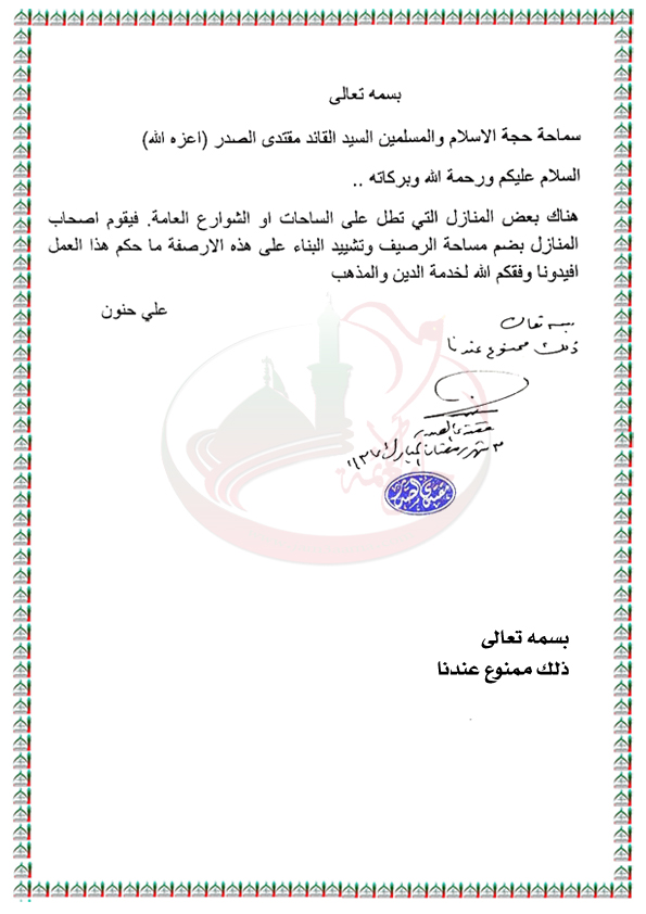 قيام بعض أصحاب المنازل بتشييد أبنية على الارصفة والساحات المطلة عليها منازلهم استفتاء السيد القائد مقتدى الصدر اعزه الله 12 / 6 / 2016