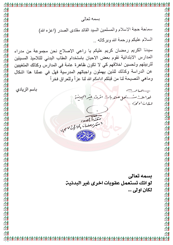 استخدام العقاب البدني من قبل مدراء المدارس لطلبة المرحلة الابتدائية لغرض تأدبيهم وتعليمهم استفتاء السيد القائد مقتدى الصدر اعزه الله 21 / 6 / 2016