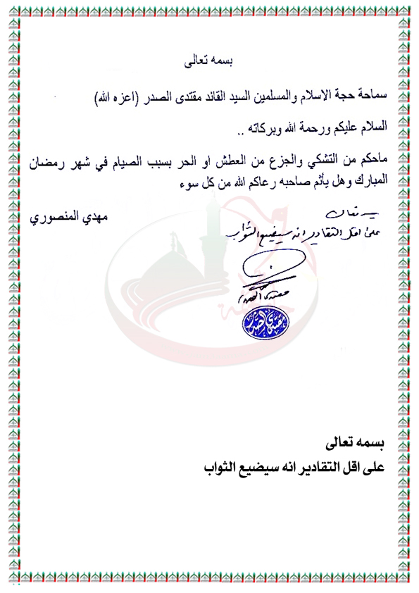 التشكي والجزع من العطش والحر بسبب الصيام في شهر رمضان المبارك استفتاء السيد القائد مقتدى الصدر اعزه الله 29 / 6 / 2016