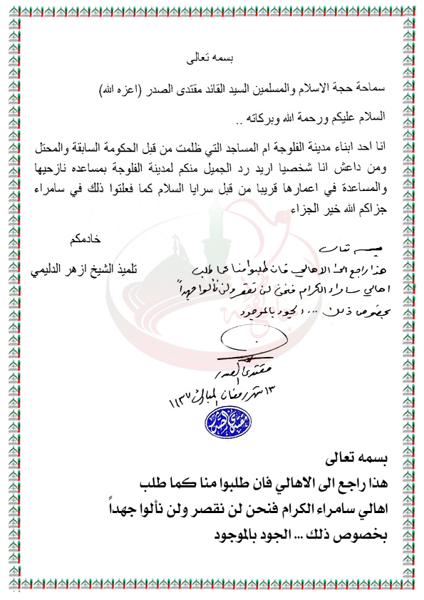 تقديم المساعدة لمدينة الفلوجة كما في سامراء استفتاء السيد القائد مقتدى الصدر اعزه الله 1 / 7 / 2016
