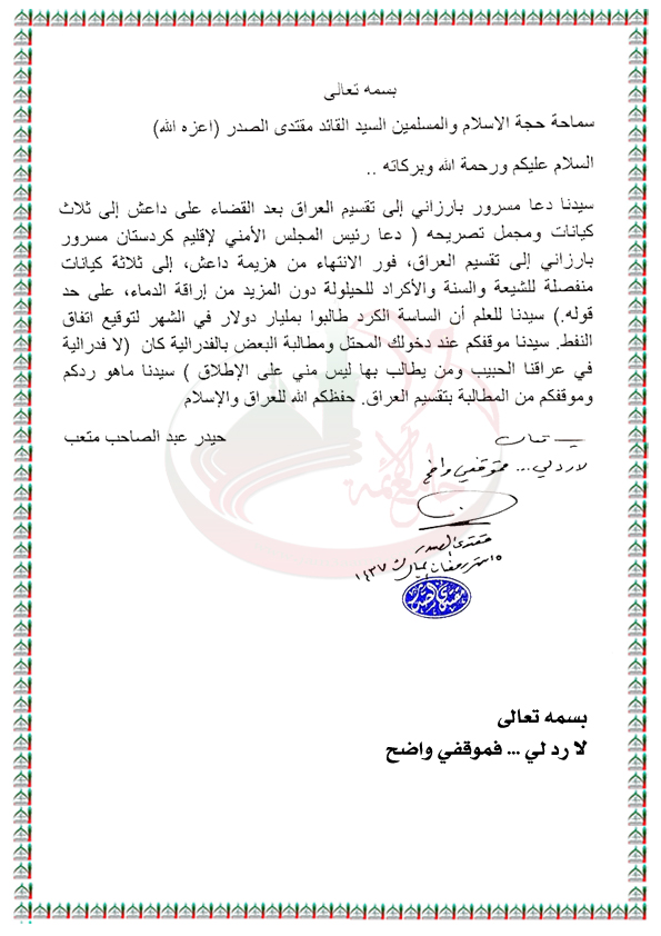 دعوة مسرور برزاني الى تقسيم العراق الى ثلاث كيانات منفصلة بعد هزيمة داعش استفتاء السيد القائد مقتدى الصدر اعزه الله 3 / 7 / 2016