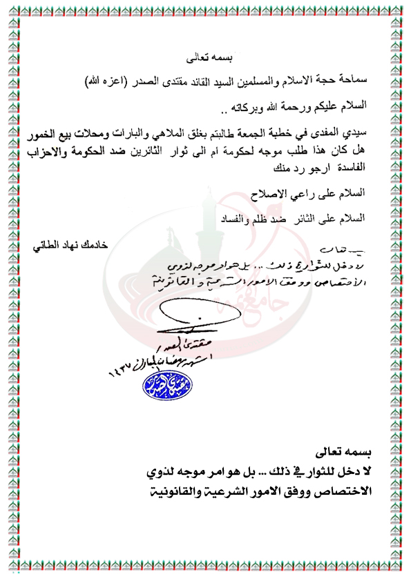 مطالبة سماحته بغلق البارات والملاهي من خلال صلاة الجمعة المباركة استفتاء السيد القائد مقتدى الصدر اعزه الله 3 / 7 / 2016