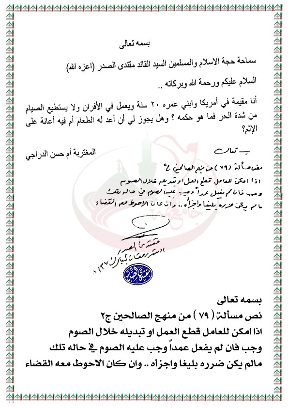 عمل احد الاشخاص في فرن صمون ولا يستطيع الصوم من شدة الحر استفتاء السيد القائد مقتدى الصدر اعزه الله 3 / 7 / 2016