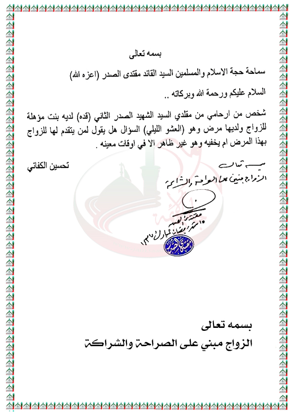 اخفاء الاب لمرض ابنته على من يتقدم لخطبتها استفتاء السيد القائد مقتدى الصدر اعزه الله 4 / 7 / 2016