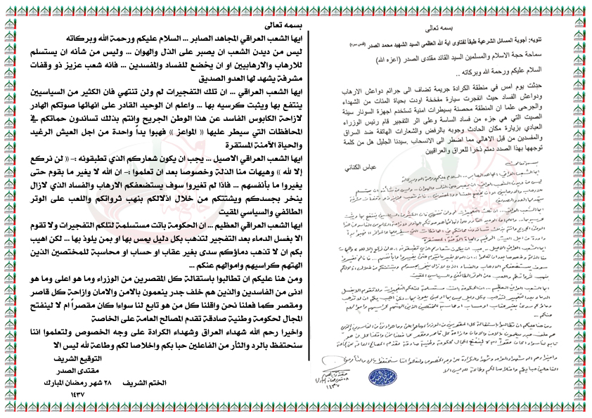 تفجير الكرادة ليس بالاخير والسياسيين ينتفعون ويثبتون كراسيهم به وعلى الشعب المطالبة باستقالة كل مقصر من كبار المسؤولين ومن هو دونهم استفتاء السيد القائد مقتدى الصدر اعزه الله 4 / 7 / 2016