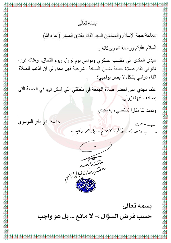 حضور صلاة الجمعة لمنتسب عسكري تقام الصلاة بالقرب من محل دوامه استفتاء السيد القائد مقتدى الصدر اعزه الله 5 / 7 / 2016