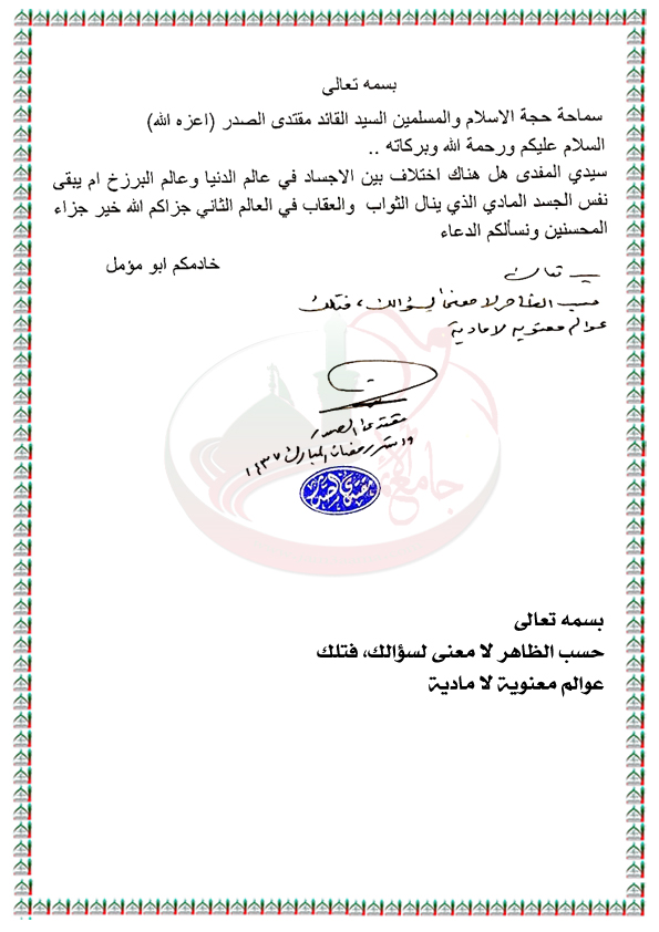 اختلاف الاجساد بين عالم الدنيا والبرزخ استفتاء السيد القائد مقتدى الصدر اعزه الله 5 / 7 / 2016
