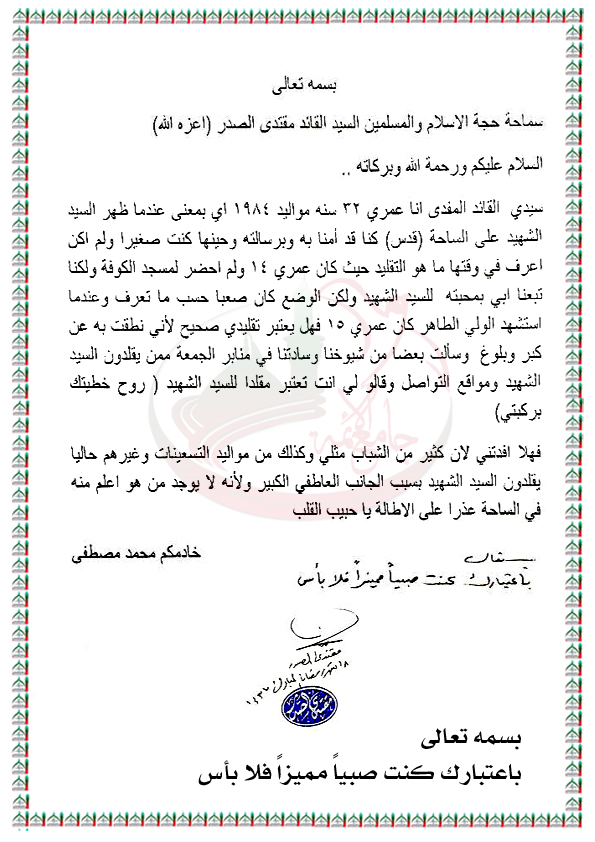 تقليد الصبي المميز للسيد الشهيد محمد محمد صادق الصدر قدس في حياته استفتاء السيد القائد مقتدى الصدر اعزه الله 5 / 7 / 2016
