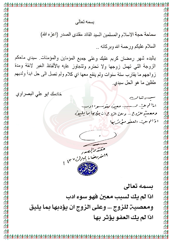 حكم الزوجة التي تتجاوز على زوجها استفتاء السيد القائد مقتدى الصدر اعزه الله 5 / 7 / 2016