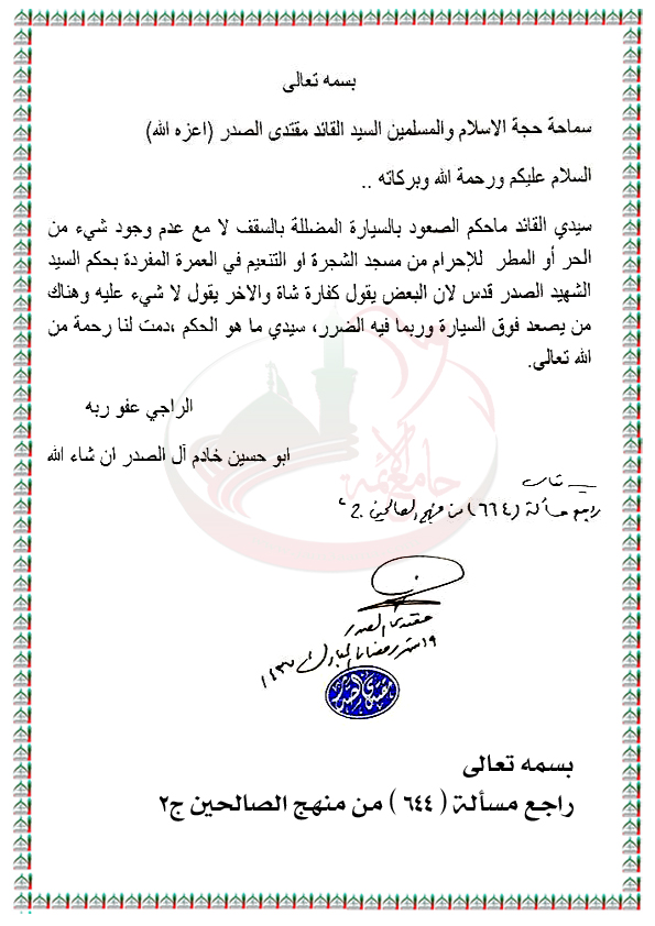 حكم المحرم الذي يصعد في سيارة مضللة بالسقف من محل الاحرام استفتاء السيد القائد مقتدى الصدر اعزه الله 5 / 7 / 2016