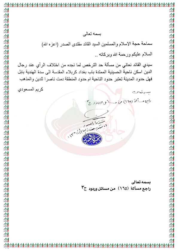 حد الترخص هل يعتبر في حدود الناحية ام حدود المنطقة استفتاء السيد القائد مقتدى الصدر اعزه الله 8 - 7 - 2016