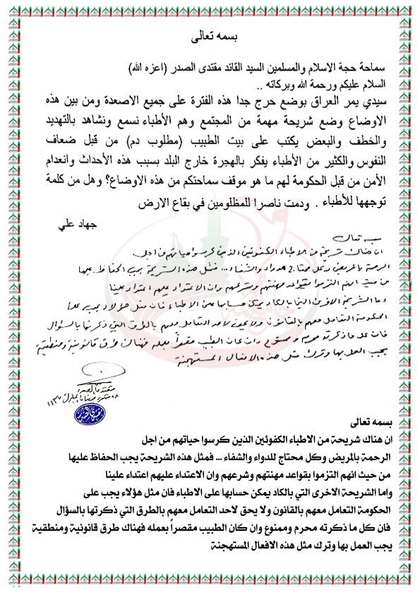 التهديد الذي يتعرض له الاطباء استفتاء السيد القائد مقتدى الصدر اعزه الله 9 / 7 / 2016