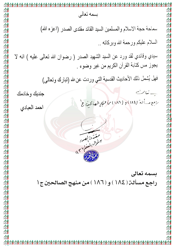 شمول الاحاديث القدسية بعدم جواز المس من غير وضوء استفتاء السيد القائد مقتدى الصدر اعزه الله 11 / 7 / 2016