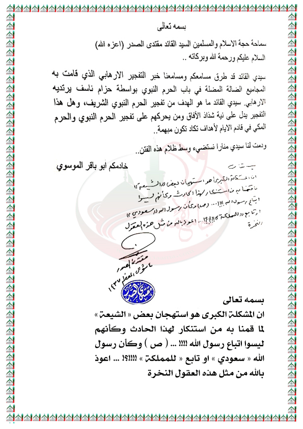 استهجان بعض " الشيعة " لاستنكار سماحته بتفجير داعش لباب الحرم النبوي الشريف استفتاء السيد القائد مقتدى الصدر اعزه الله 12 / 7 / 2016